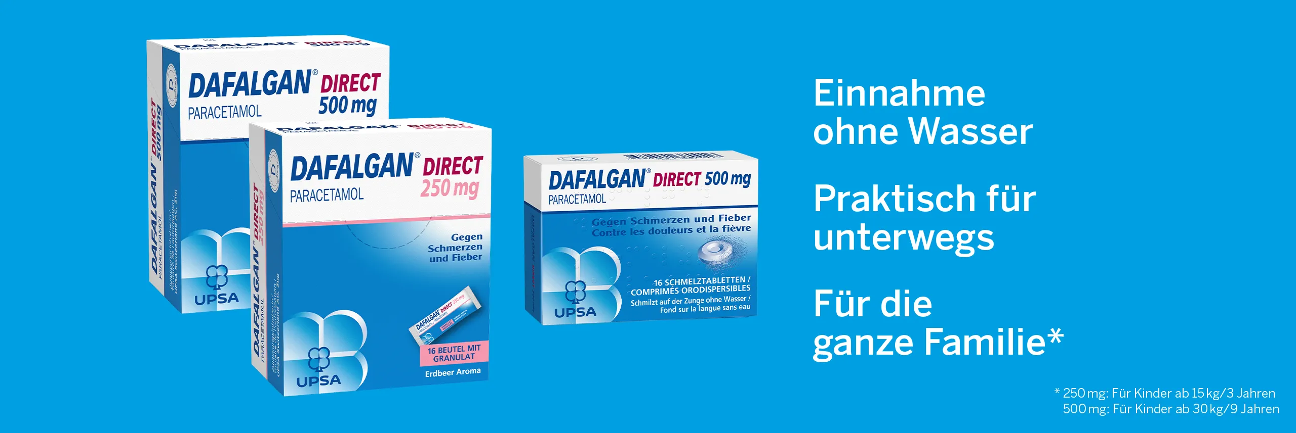 Fieber und Schmerzen können uns ohne Vorwarnung überfallen. Oft treten sie gerade dann auf, wenn man kein Wasser zur Hand hat, sei es auf dem Weg zur Arbeit, draussen mit Freunden oder Familie oder auf Reisen. Für solche Fälle gibt es DAFALGAN® DIRECT. DAFALGAN® DIRECT lässt sich bequem anwenden, denn das feine Granulat mit angenehmem Geschmack zergeht schnell auf der Zunge, ohne die Einnahme von Wasser. Dank der praktischen Beutel passt DAFALGAN DIRECT® zudem in jede Hand- oder Hosentasche und eignet sich deshalb besonders für unterwegs und auf Reisen. Ideal auch für alle, die nicht gerne Tabletten schlucken. DAFALGAN® DIRECT 250mg ist bereits für Kinder ab 15kg Körpergewicht und 3 Jahren geeignet. DAFALGAN DIRECT 500mg ist für Erwachsene und Kinder ab 30kg und 9 Jahren.